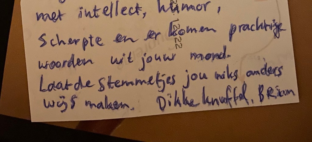 Dus ik heb een stapje gezet in het geleidelijke terugkeerproces: mijn scherpte is er weer. En dan nu lekker hard werken! Bij Rootz mooie items verkopen, met Yvette en de andere medewerkers, die allemaal ook heel hard werken. En vanuit Hoedan, mijn eigen advies- en projectbureautje, gemeentes helpen bij het ‘hoe dan’ van hun ambities. Dat is altijd hard werken. En tussendoor lekker genieten van vier gezellige kinderen, mijn familie, vrienden en van Ben (die niet meer als een WenBen voelt, maar lief, gezellig en stevig rondstiefelt in mijn leven). Er volgen vast nog meer stappen in het rouwproces. Blijkbaar zie je het soms pas achteraf. Ook dat blijft hard werken.